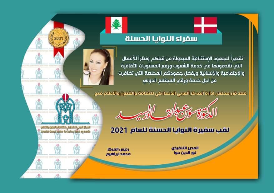 شكراً للمركز العربي الدانمركي منحي لقب سفيرة النوايا الحسنة للعام 2021 و شكراً للرسام حسن زين الدين لهذه الهدية بمناسبة تعييني